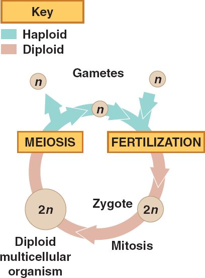 Gametes (sex cells) have 1 set (n) of chromosomes (haploid) and are produced by meiosis.